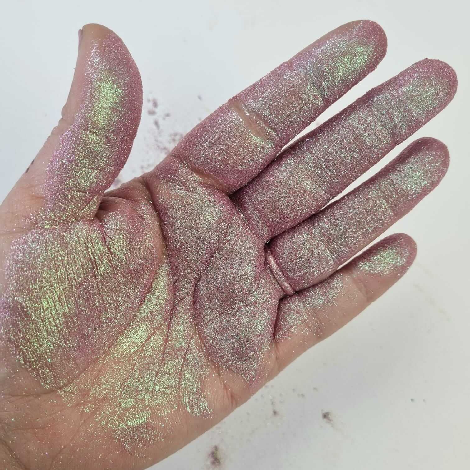 As fine as dust yet shimmering with sparkle, this pigment embodies elegance with its subtle transition from pink to green, evoking beauty and delicacy.